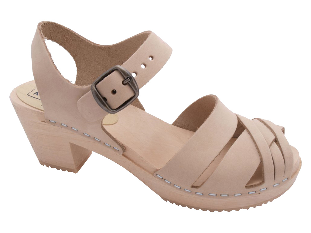 Wooden clog sandal with braided front part. Upper in real nubuk leather. Non coloured woodensole from Swedish alder. Heel height 6,5 cm.