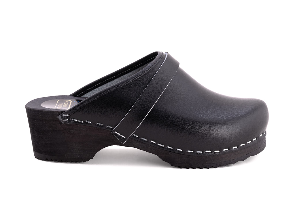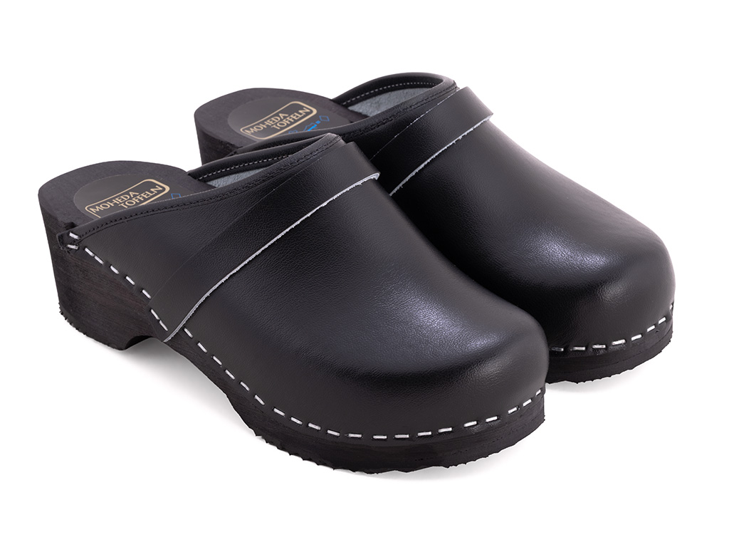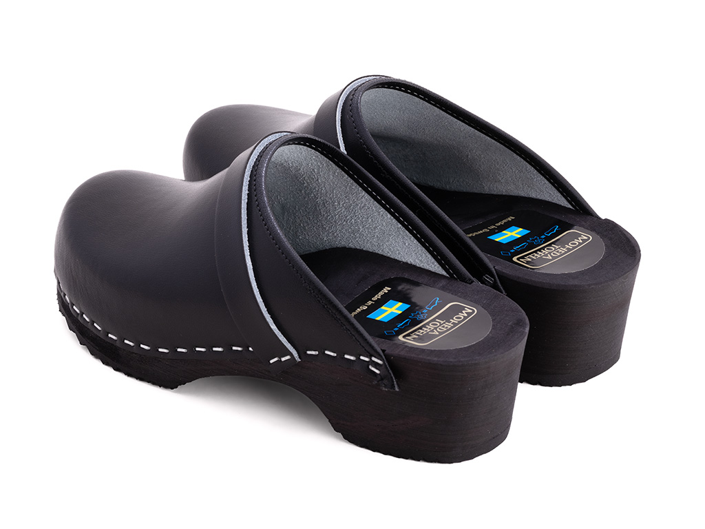 Emil is a stylish and robust wooden slipper in the classic smé model, perfect for those who appreciate both comfort and traditional craftsmanship. The upper in black genuine leather has a protective surface layer that makes the slipper durable and hard-wearing, while the black-stained wooden sole provides an elegant and stylish finish.